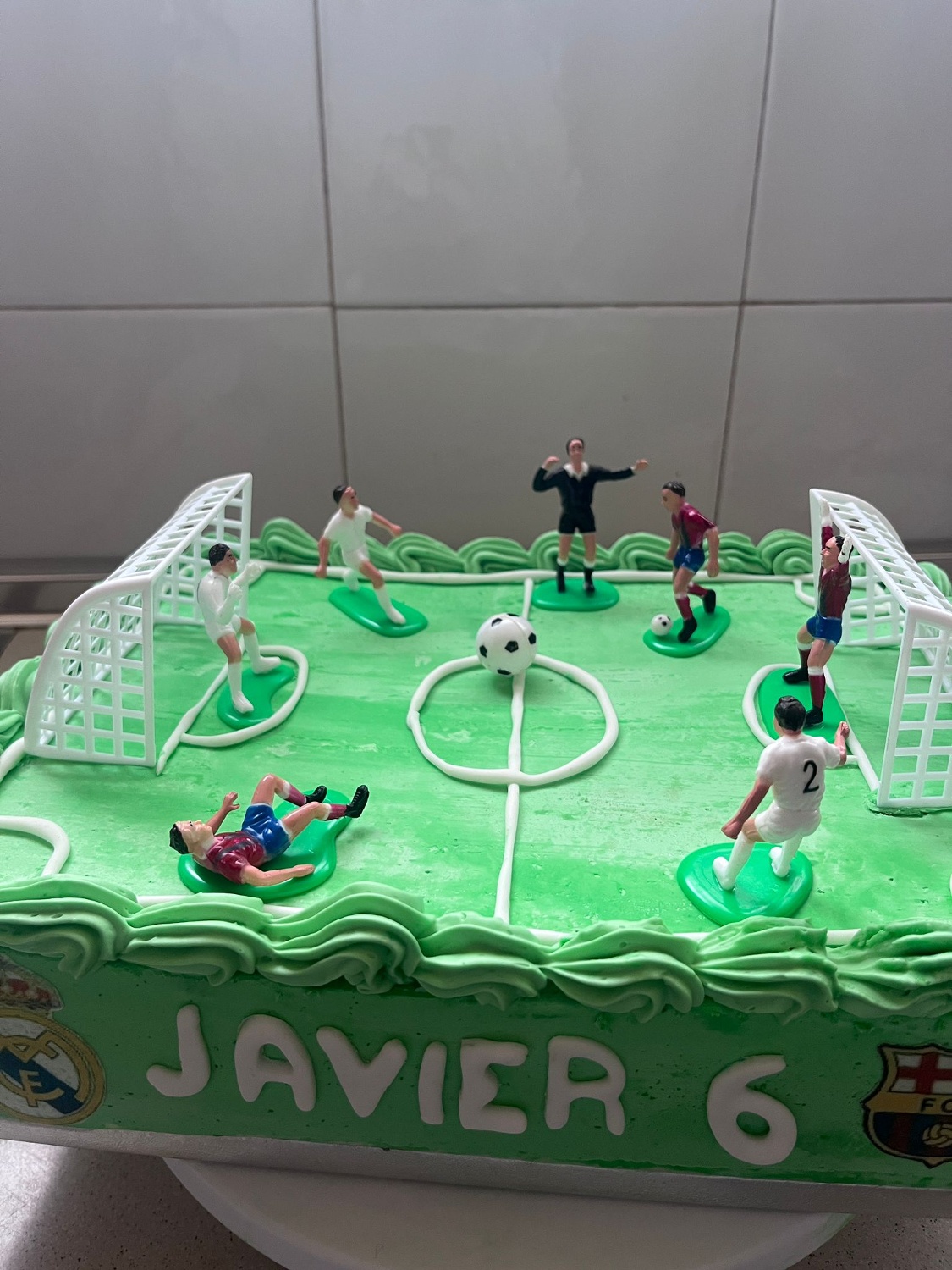 Este produto é composto por 4 figuras de futebolistas com camisolas e calções brancos e azuis, 1 árbitro com um uniforme preto e 2 balizas. Cada figura tem uma base verde para facilitar a colocação no bolo.