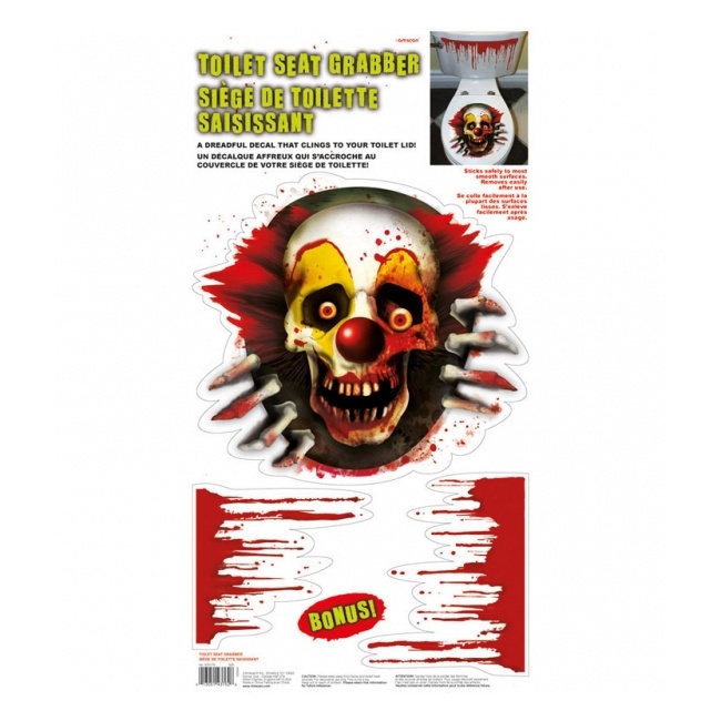 Tem um autocolante grande para colar na tampa que simula um palhaço sedento de sangue a sair do buraco e 2 tiras de sangue a pingar para colocar no autoclismo.