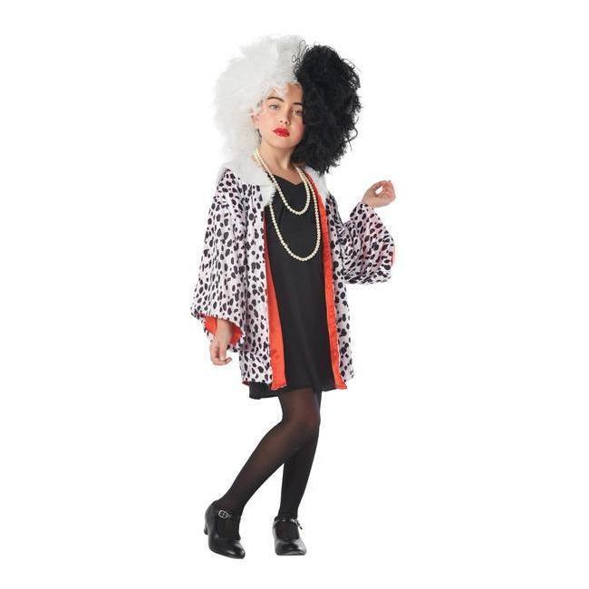 Esta fantasia é composta por um vestido preto com uma saia média, que é apertado com duas alças nas costas. Por cima, um casaco com mangas largas, forro vermelho e um padrão decorativo com manchas de dálmatas no exterior. Não se esqueça de completar o fato com a peruca preta e branca abaixo.