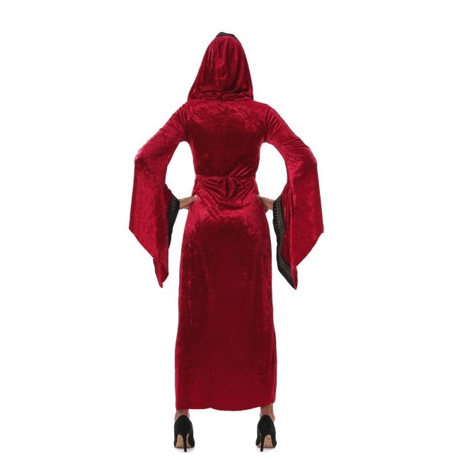 O artigo é composto por um vestido vermelho com um capuz com mangas largas.