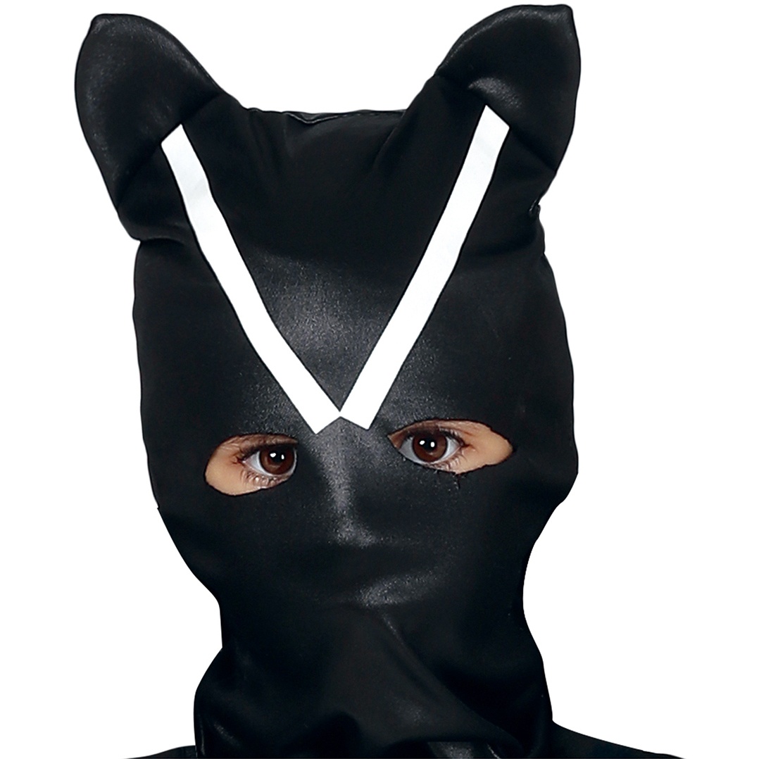 Esta fantasia inclui um macacão de corpo inteiro (mangas e pernas longas) na cor preta com adornos e detalhes na cor prata. Combina-se com uma capa e um capuz do mesmo tom, equipado com dois orifícios para os olhos e adornos de orelhas no topo.