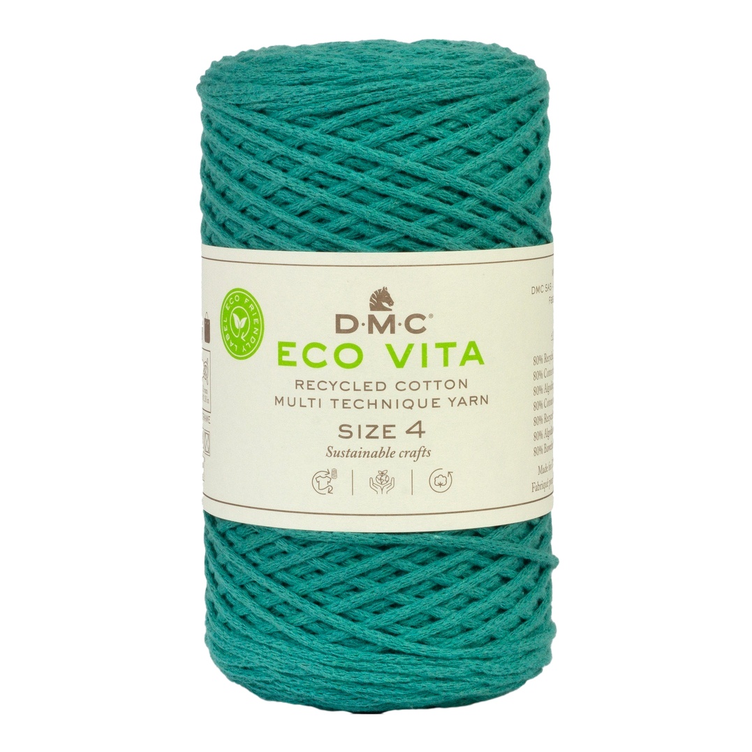 Fabricado com algodão reciclado, o Eco Vita 4 é um fio grosso e tubular perfeito para fazer macramé, tricotar ou crochê em acessórios para a casa, como cestas, vasos, almofadas e abajures.