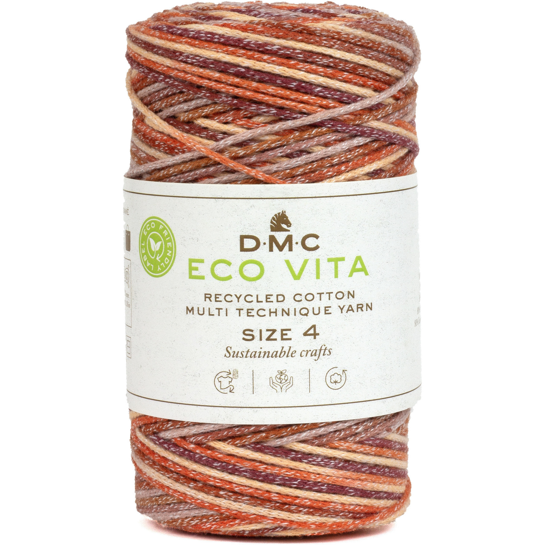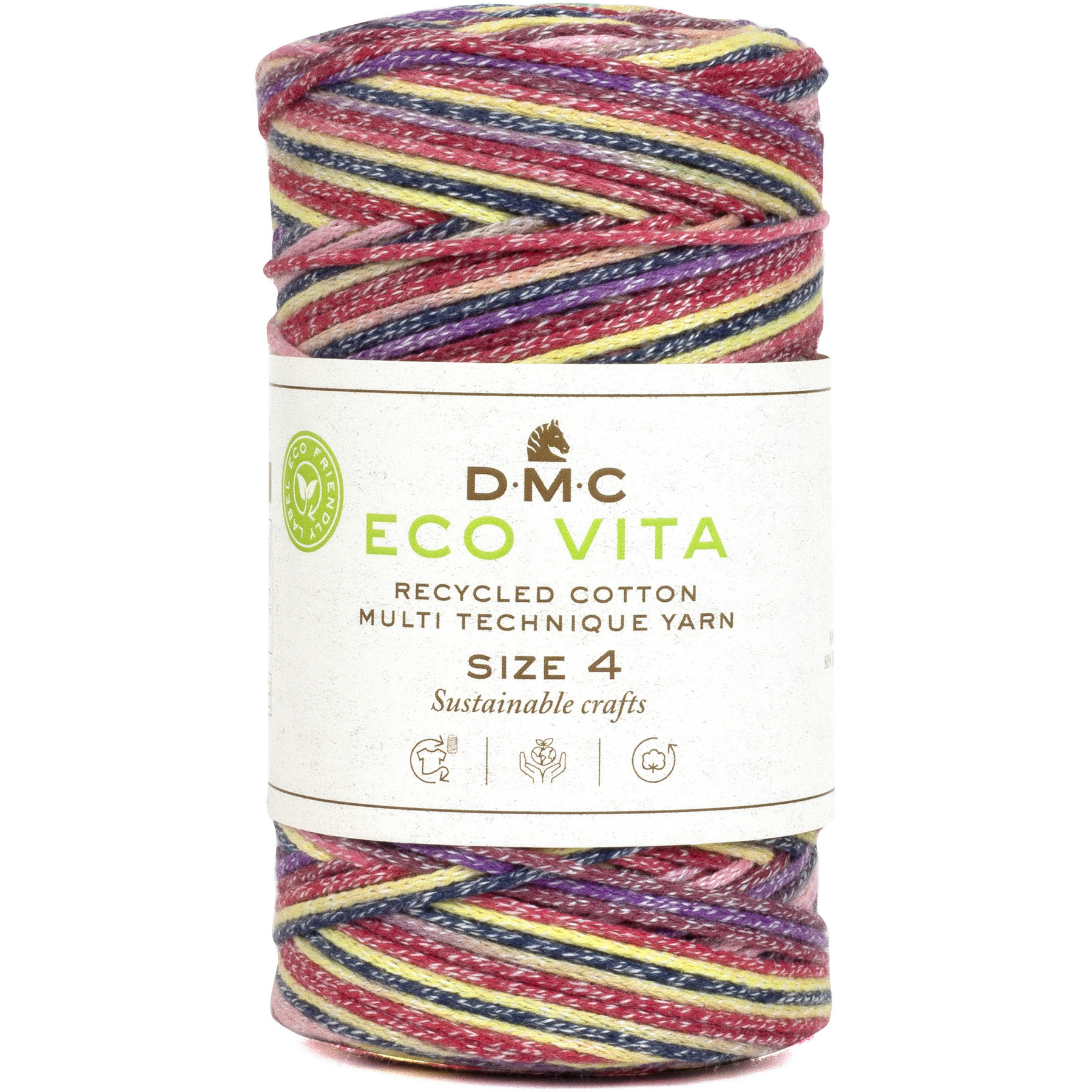 Fabricado com algodão reciclado, o Eco Vita 4 é um fio espesso e tubular, ideal para macramé, tricô ou crochê em acessórios para o lar, como cestos, cachepôs, almofadas e abajures.