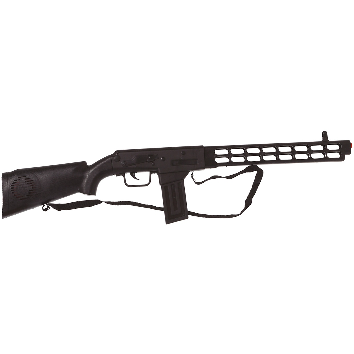 Arma de assalto com a forma de uma espingarda da polícia. É feita de plástico preto e pode ser utilizada como acessório para fatos policiais ou militares ou para o tema da Casa de Papel.