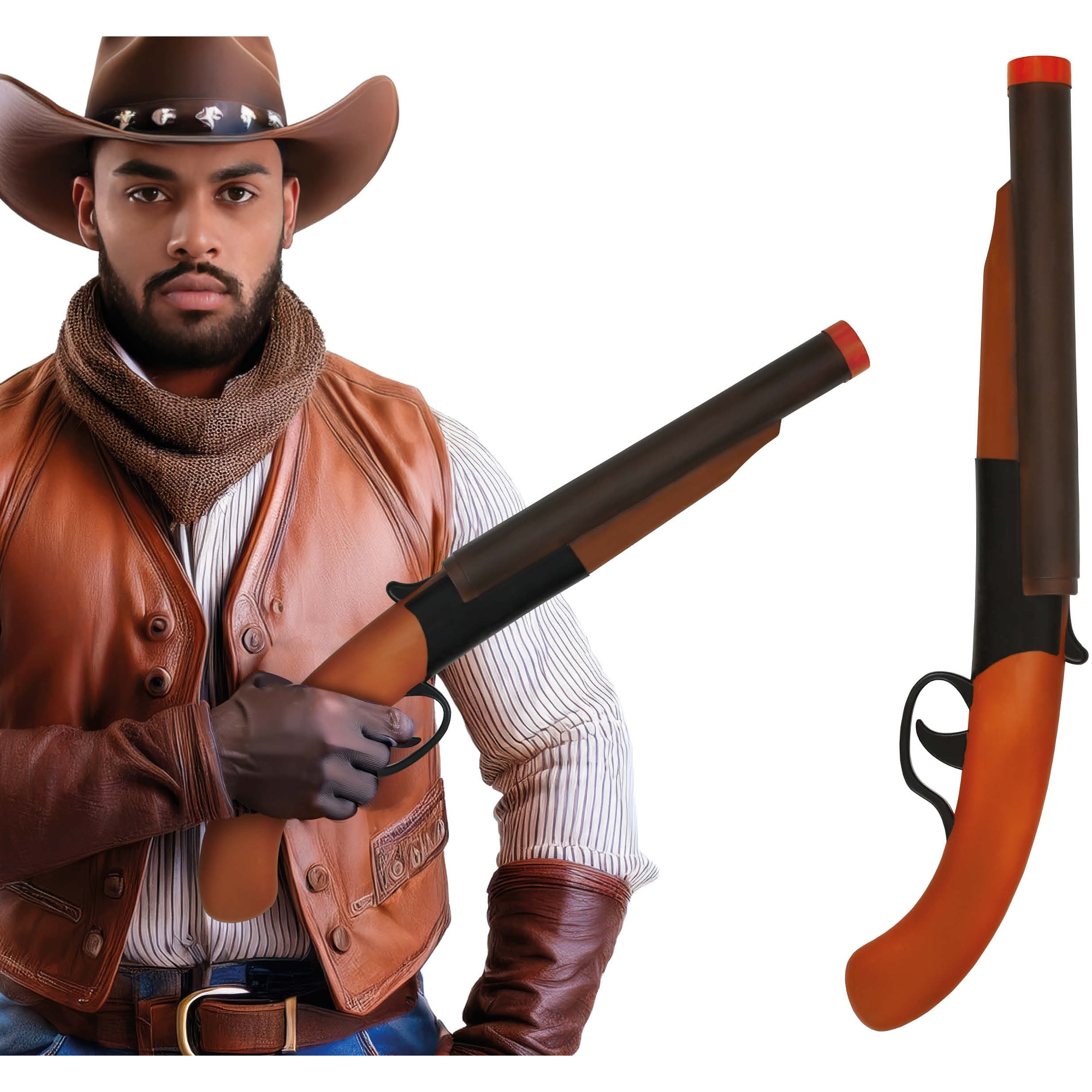 Espingarda de brinquedo pensada para completar trajes de estilo western e cenários festivos. Apresenta um efeito de recuo que aporta realismo sem recorrer a peças perigosas. Fabricada em PVC leve para um manuseio confortável durante celebrações, desfiles e sessões fotográficas. Ideal para o Carnaval, photocalls e festas temáticas quando o senhor ou a senhora desejar um acessório vistoso e seguro.