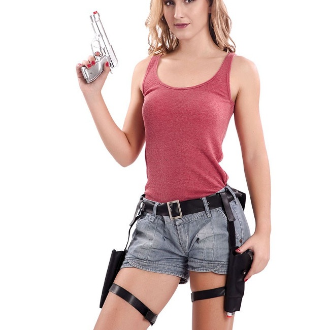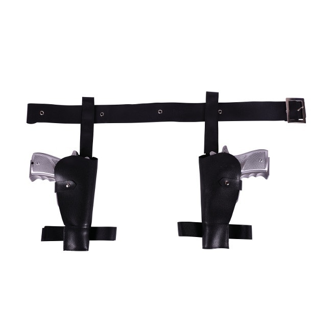 Estojo de lápis em pele preta com alças ajustáveis na cintura e nas pernas. As pistolas são de plástico prateado.