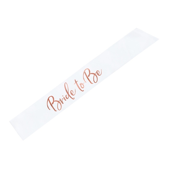 Bonita faixa branca com letras em ouro rosa. Ideal para fazer com que a noiva se sinta especial no dia da sua despedida de solteira.
