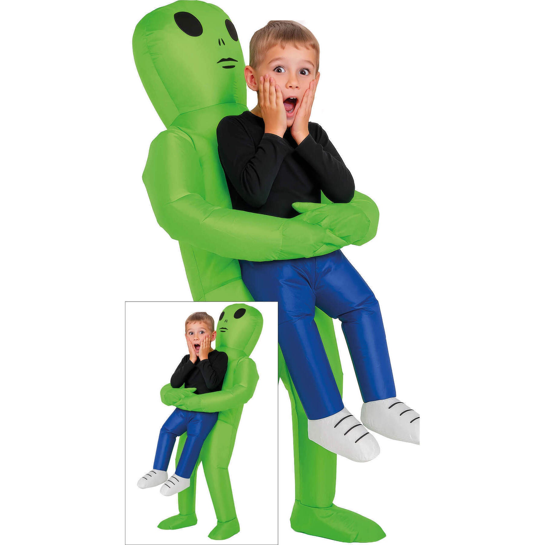 Fantasia infantil de criança nos braços de um alienígena inflável