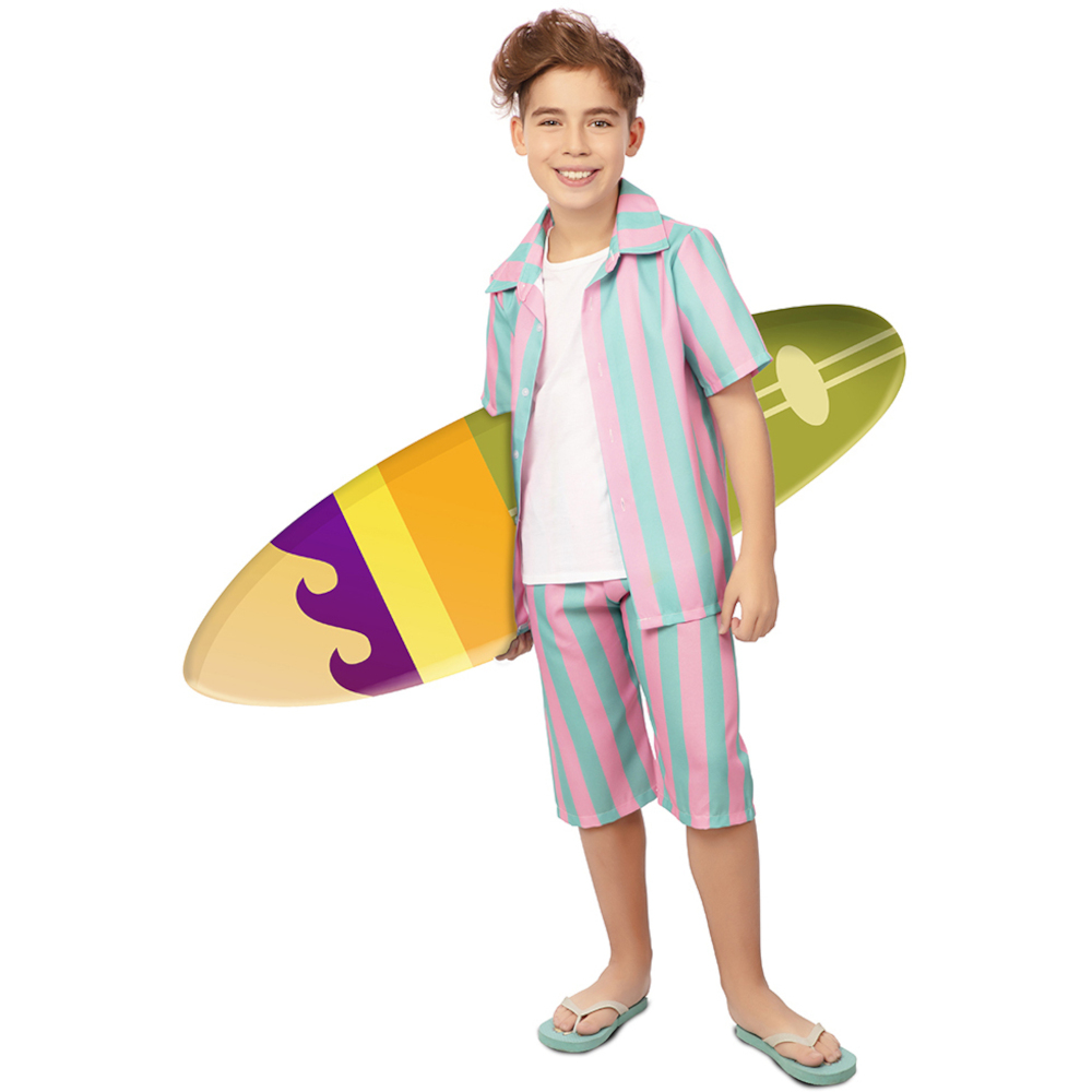 Uma fantasia divertida de surfista para menino, muito colorida para que o seu filho não passe despercebido.