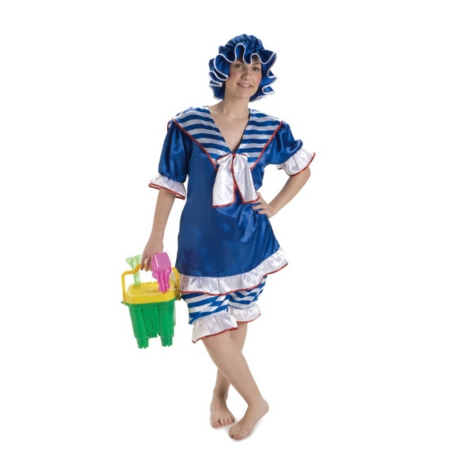 Camisa azul-marinho com um laço que combina com as calças às riscas azuis e brancas. Por outro lado, vem com a típica touca de banho que estava na moda na altura, com uma fita vermelha e elástico para que se adapte melhor ao tamanho da cabeça.