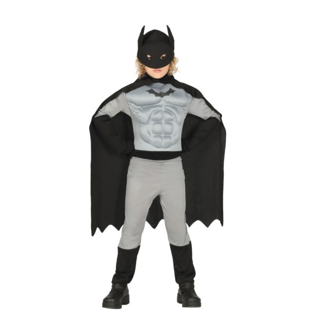 Com esta fantasia, vais sentir-te como o verdadeiro Batman. Trata-se de um macacão cinzento com um efeito musculado no peito e no abdómen.