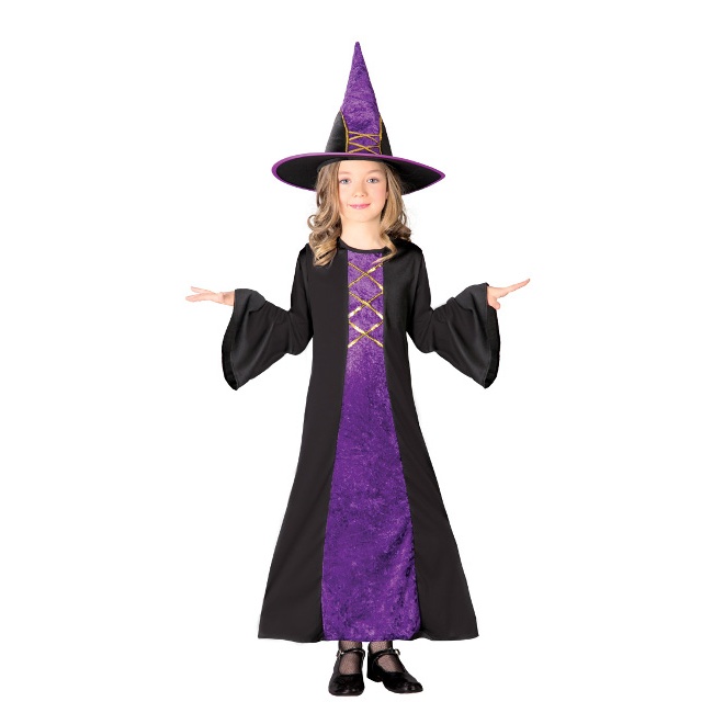 Fato de bruxa clássico que não pode faltar na noite de Halloween. É composto por um vestido comprido com mangas compridas e mangas de abas em preto e lilás intenso.