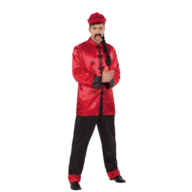 Fato de estilo oriental para adultos composto por uma camisa vermelha comprida, calças pretas e chapéu a condizer.