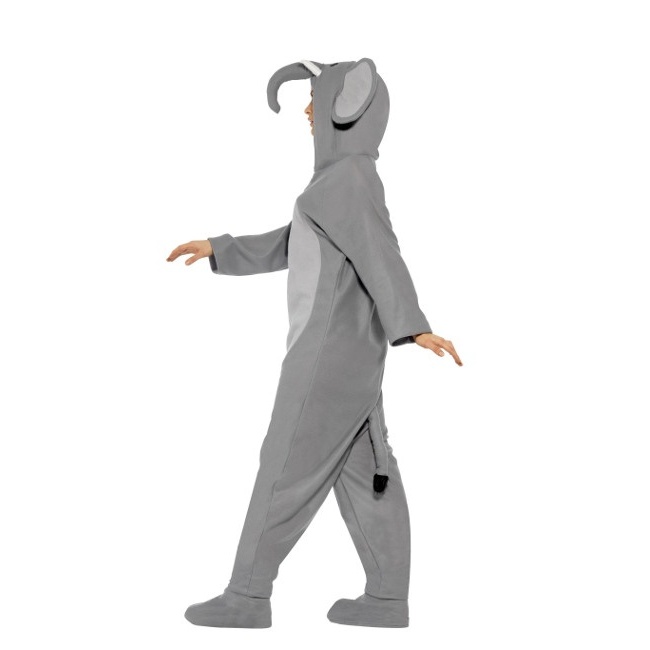 O capuz tem orelhas grandes e a sua tromba caraterística com presas brancas. Como o disfarce tem cobertura para os pés, pode prendê-lo à parte de baixo dos seus sapatos e, finalmente, a cauda é cosida atrás com pêlos pretos na ponta.