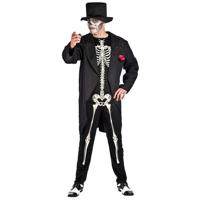 Este assustador fato de Senhor dos Mortos é composto por um macacão preto com a imagem de um esqueleto humano, um casaco preto, um cinto com caveiras decoradas como na festa mexicana do Dia dos Mortos e um chapéu de tecido.