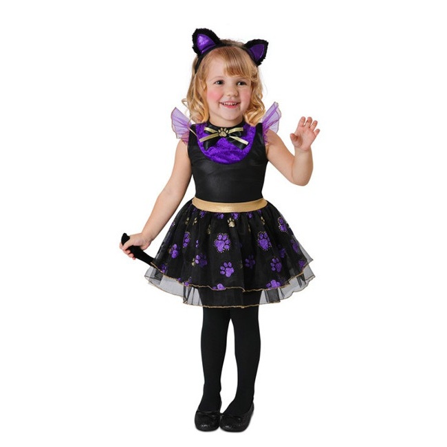 Esta fantasia de gatinho é perfeita para as festas infantis ou para o carnaval. É composto por um vestido preto com pormenores lilás e dourados. A saia é coberta por uma sobreposição de tule com estampados de gatos que dá volume ao fato.