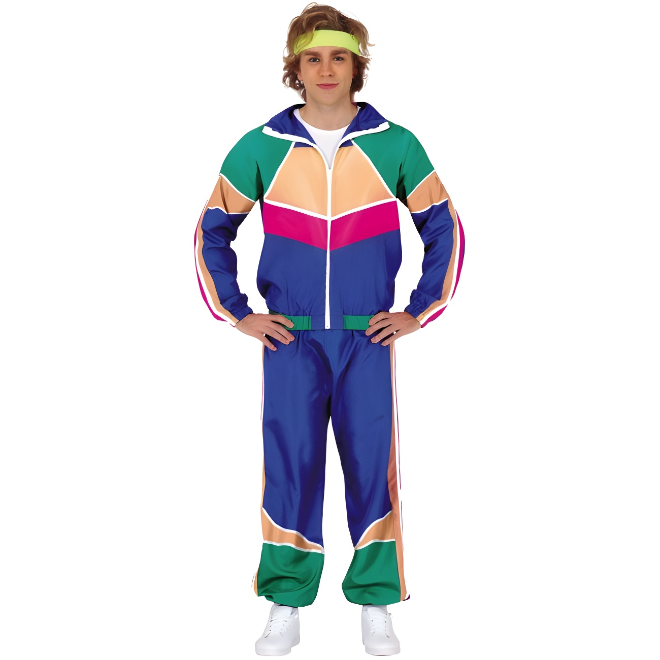 Fato de ginasta colorido dos anos 80 para homem
