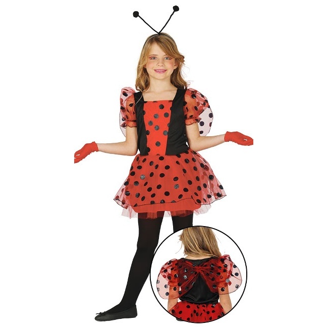 Uma fantasia de joaninha muito bonita para menina, toda em vermelho e preto. A saia tem três camadas, uma delas de tule, para ficar mais levantada.