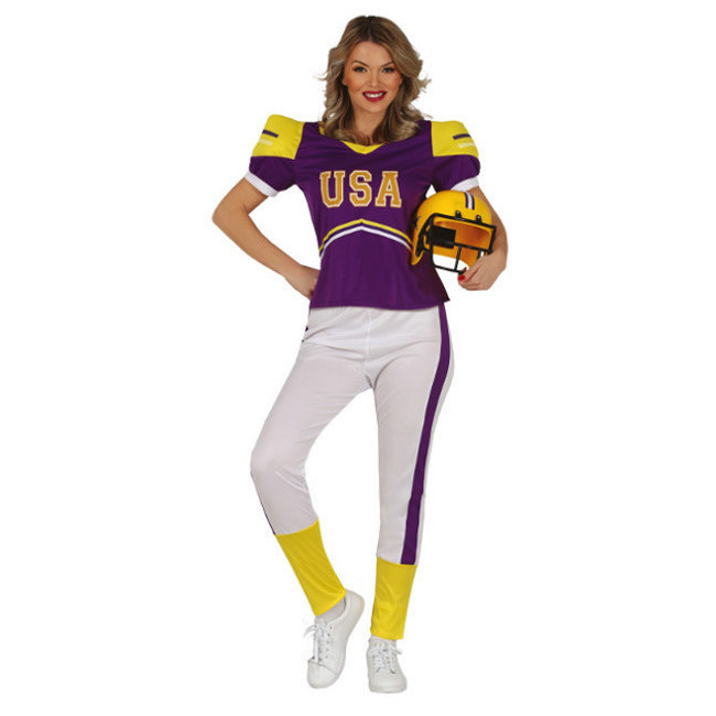 Esta bela fantasia de jogadora de futebol americano é composta por uma camisola lilás com letras U.S.A. amarelas no peito, a condizer com as ombreiras. Inclui um acolchoamento nas ombreiras para dar volume.