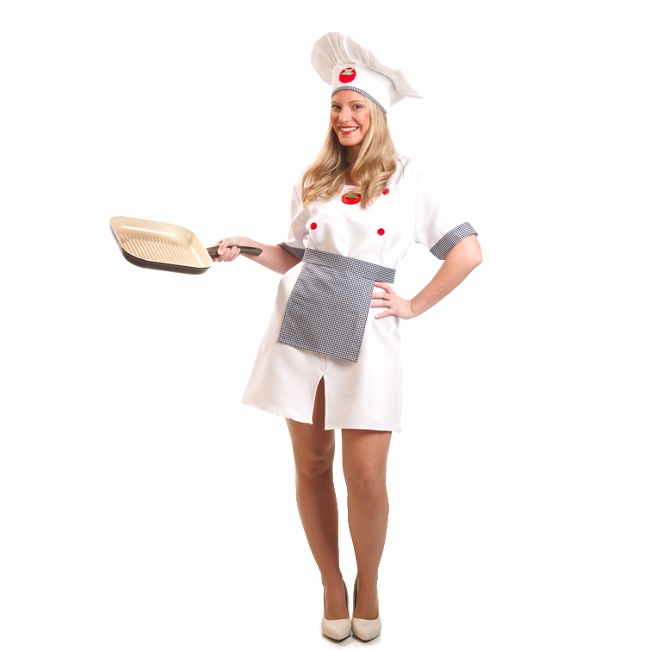 Composto por um vestido branco com uma pequena abertura no meio e combinando um avental tradicional feito de tecido vichy axadrezado preto e branco. O fato é adornado com botões e um engraçado tomate vermelho a condizer com o chapéu de cozinheiro.