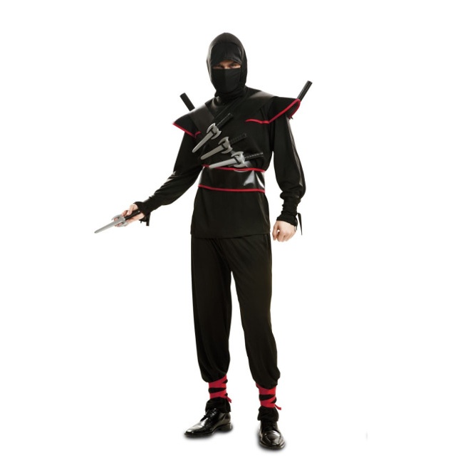 É composto por um capuz com uma máscara preta para cobrir o rosto, uma t-shirt e calças de cor escura e um cinto com alças para segurar as armas.