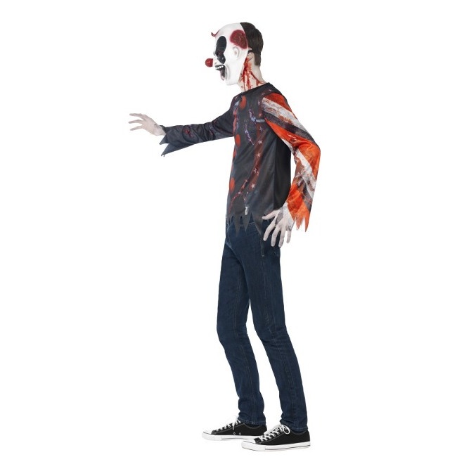 Um fato de palhaço aterrador composto por uma camisa de mangas compridas com grandes pompons vermelhos e marcas de sangue impressas, juntamente com suspensórios estrelados e uma máscara de látex com a cara de um palhaço malvado que cobre todo o rosto. A camisa tem um acabamento com picos irregulares nos punhos e na bainha para lhe dar um aspeto mais realista.