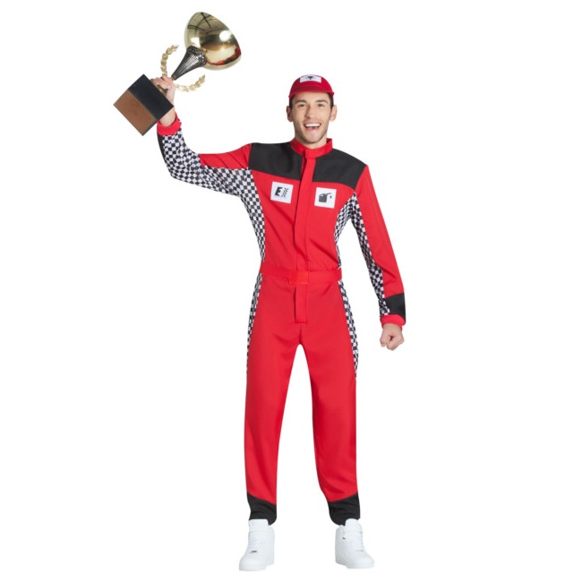 Este fato é composto por um macacão vermelho com diferentes detalhes que compõem o uniforme do piloto de corridas, como a risca axadrezada preta e branca de lado ou os símbolos no peito.