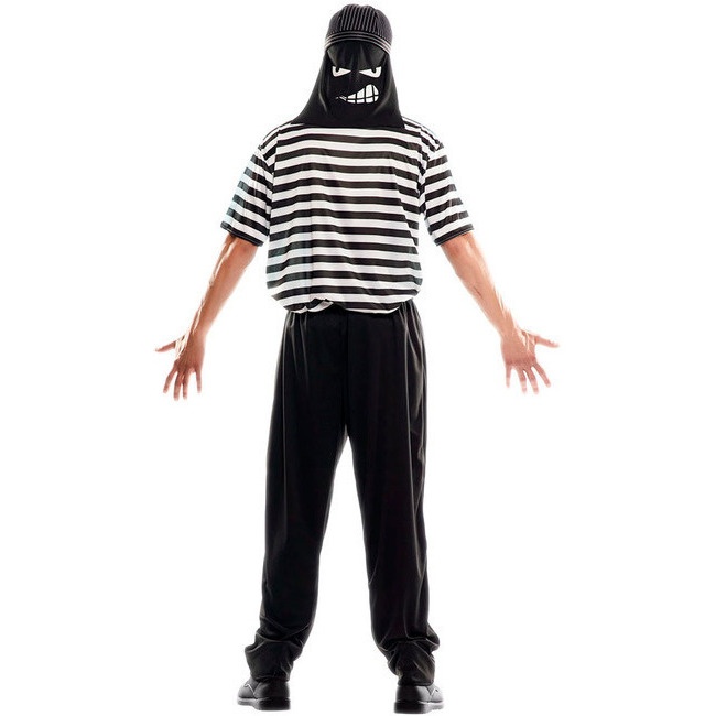 Concebido para carnavais e festas temáticas, a parte da frente deste disfarce apresenta uma camisa azul com botões para apertar, uma gravata preta, um distintivo da polícia do lado direito e a inscrição "police" do lado esquerdo. Inclui calças pretas com cintura elástica e um boné preto com as inscrições acima em branco. A parte da frente do acessório apresenta o rosto de um ladrão num tecido preto. A parte de trás do fato é constituída por uma T-shirt às riscas pretas e brancas com calças pretas.