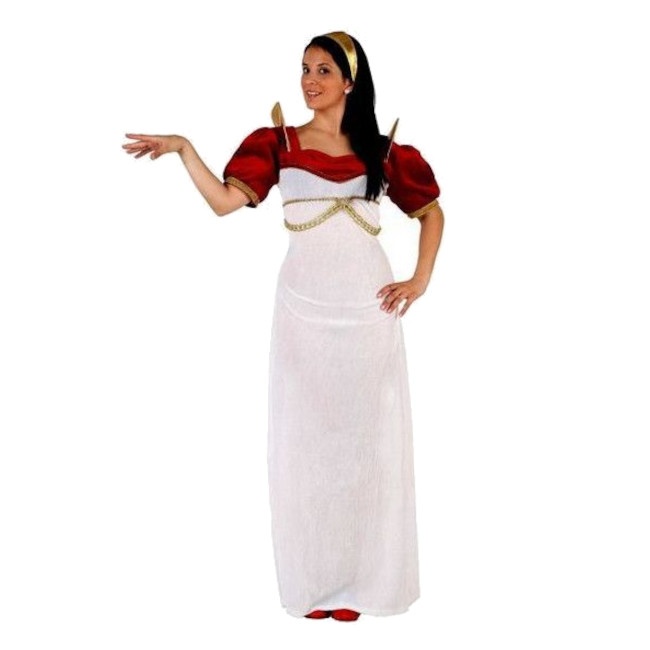 Elegante vestido branco aveludado com mangas vermelhas e ombreiras peculiares. Como pormenor, tem correntes douradas no peito. Tem fitas de lado que são atadas atrás das costas para ajustar a cintura e fazer uma bela figura. Como complemento, vem com um elegante toucado em forma de coroa em dourado com elástico para melhor ajuste.