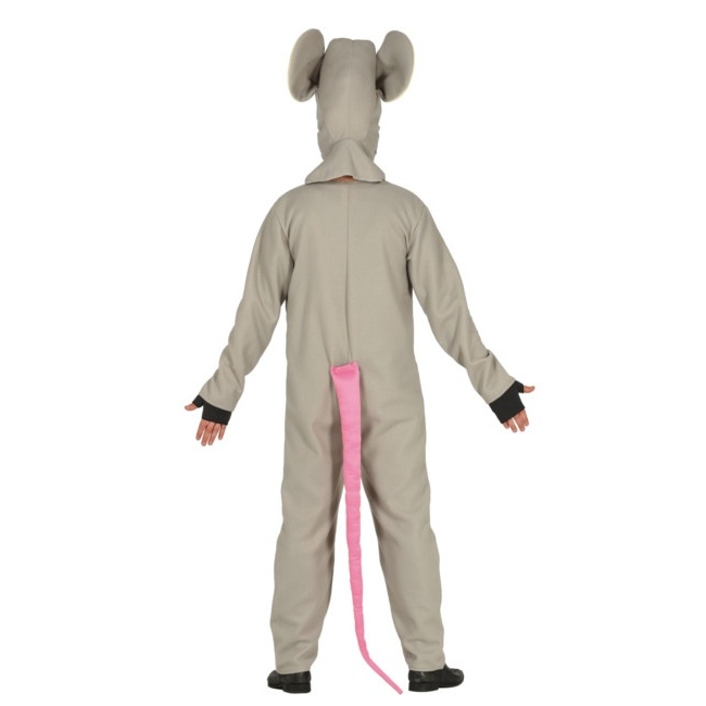 O capuz é o que formaria a cabeça do rato com duas orelhas enormes e um focinho comprido com um nariz. Aperta com velcro à volta do pescoço e deixa ver a cara, pelo que é muito confortável de vestir.