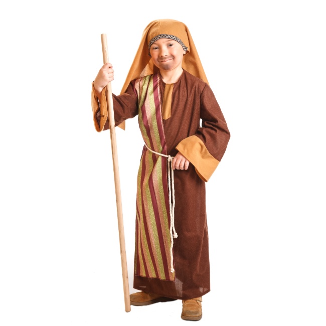Túnica castanha que também faz parte do manto com estampado às riscas. Tem um cordão na cintura que funciona como cinto para que possas ajustar a túnica ao teu tamanho. Para completar o look do São José, ele usa o lenço na cabeça num tom mais claro de castanho.