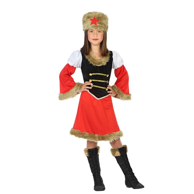 Inclui um chapéu de pelo castanho com uma estrela vermelha na frente que completa o fato russo da menina.