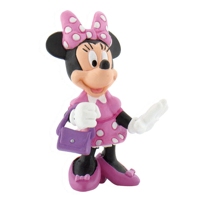 Figura engraçada da Minnie Mouse com uma mala de mão pendurada nos braços para decorar o bolo da sua festa de aniversário, ela vai conquistar toda a gente!
