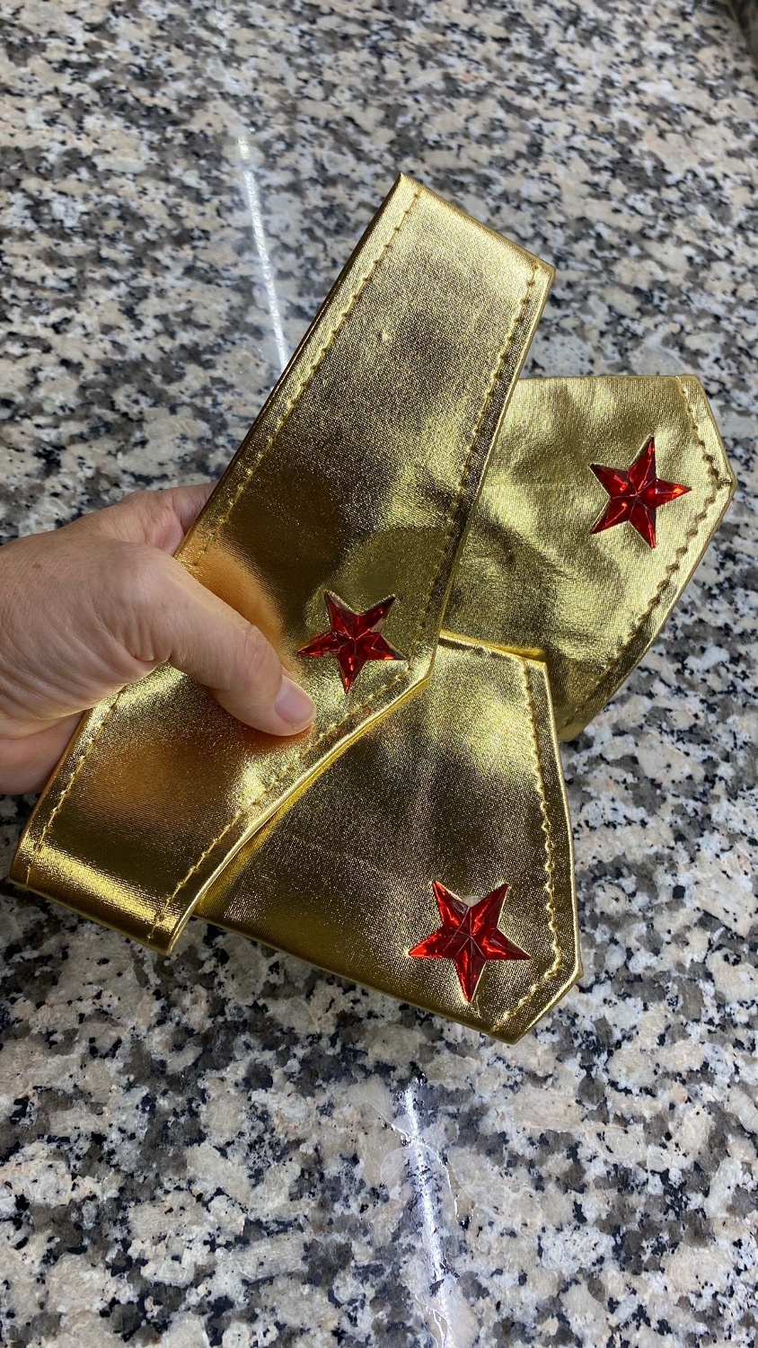 Este produto é composto por uma tiara dourada, com elásticos na parte de trás e uma estrela vermelha na parte da frente. As pulseiras também são douradas e têm estrelas vermelhas nos dois braços, seguindo o estilo da Wonder Woman.