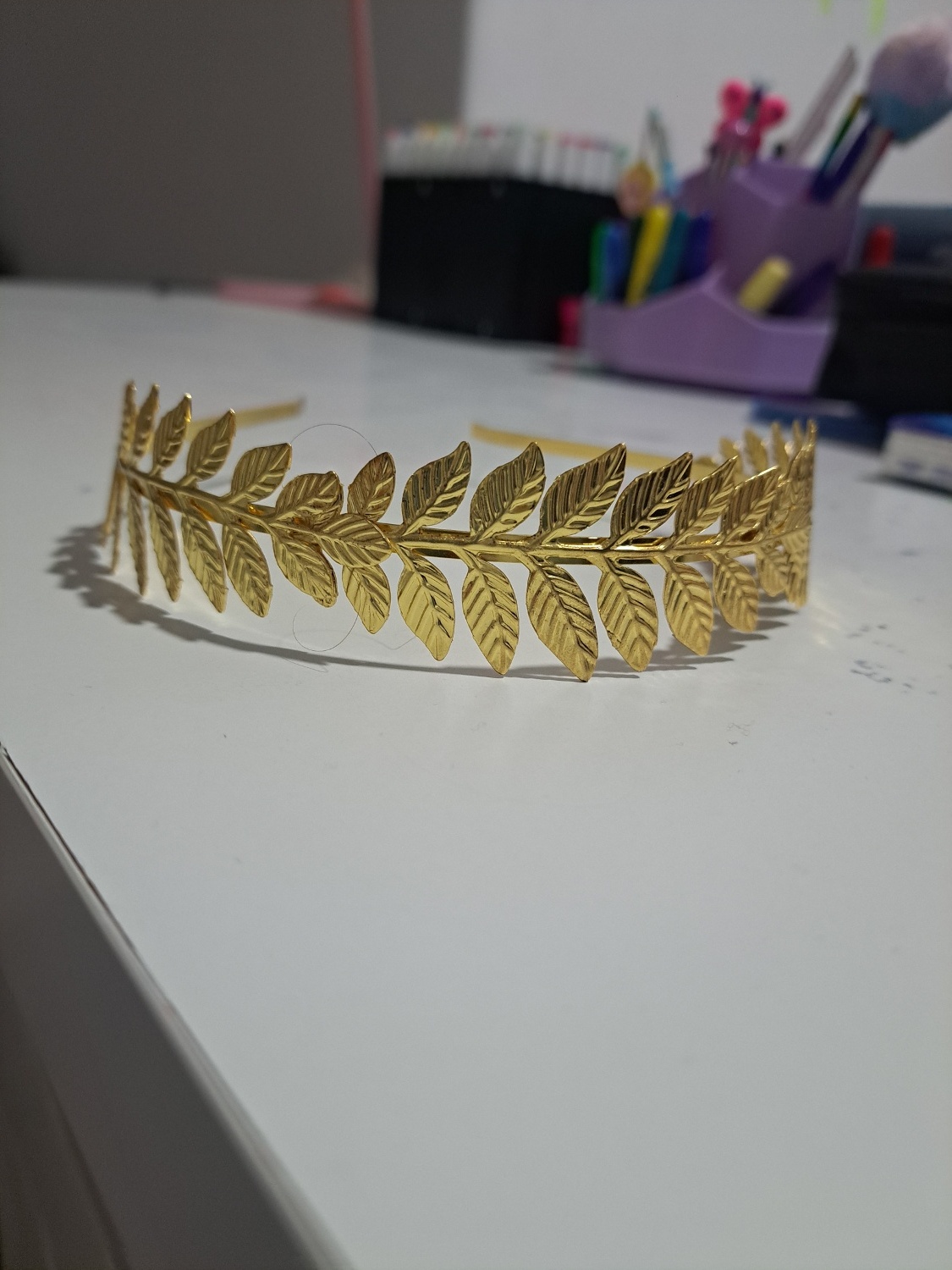 Trata-se de uma coroa em forma de tiara metálica dourada com folhas de louro na parte da frente.