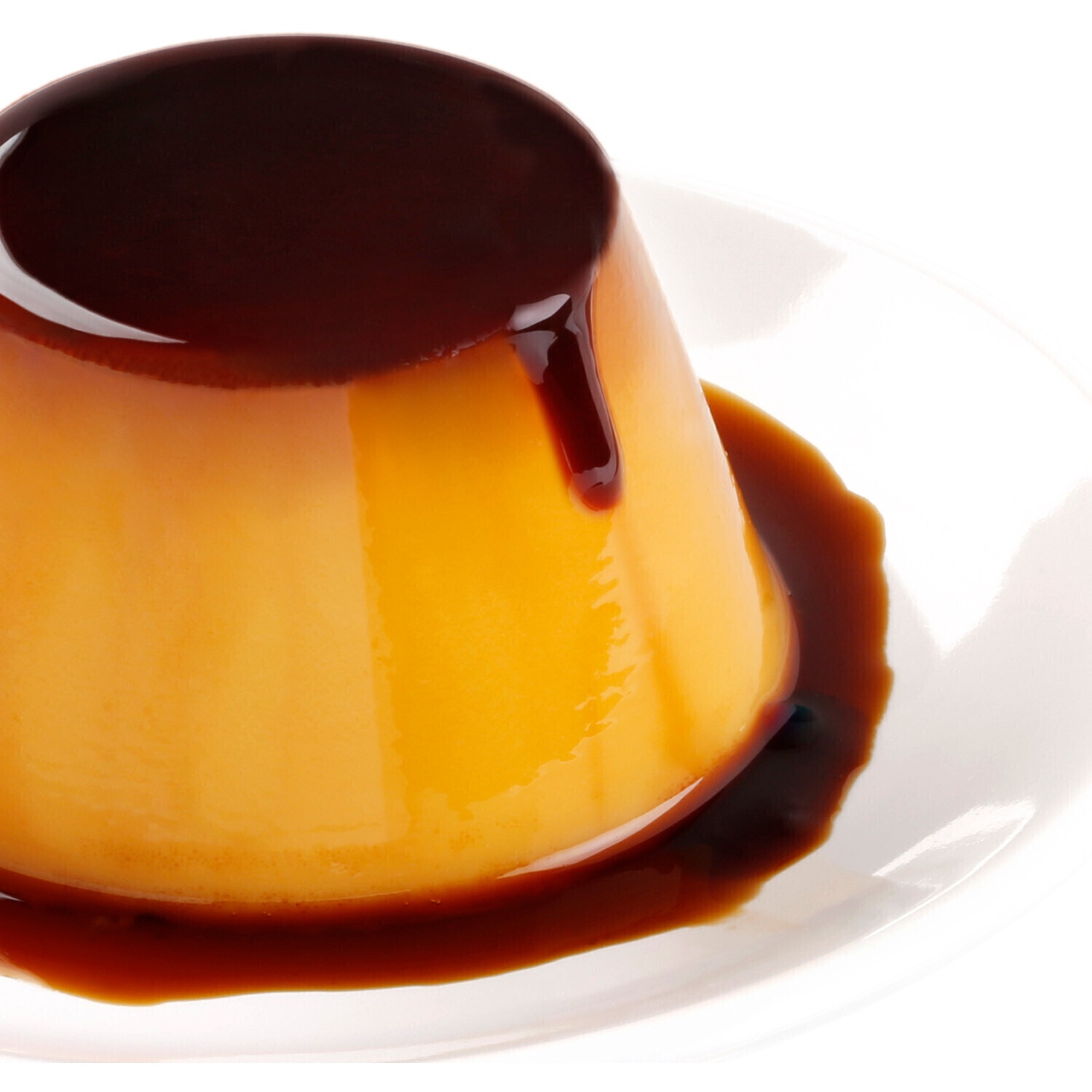 Ingredientes flan: Açúcar, espessante (carragenana), aromas, óleo de girassol e corantes (E160b (ii) e curcumina).