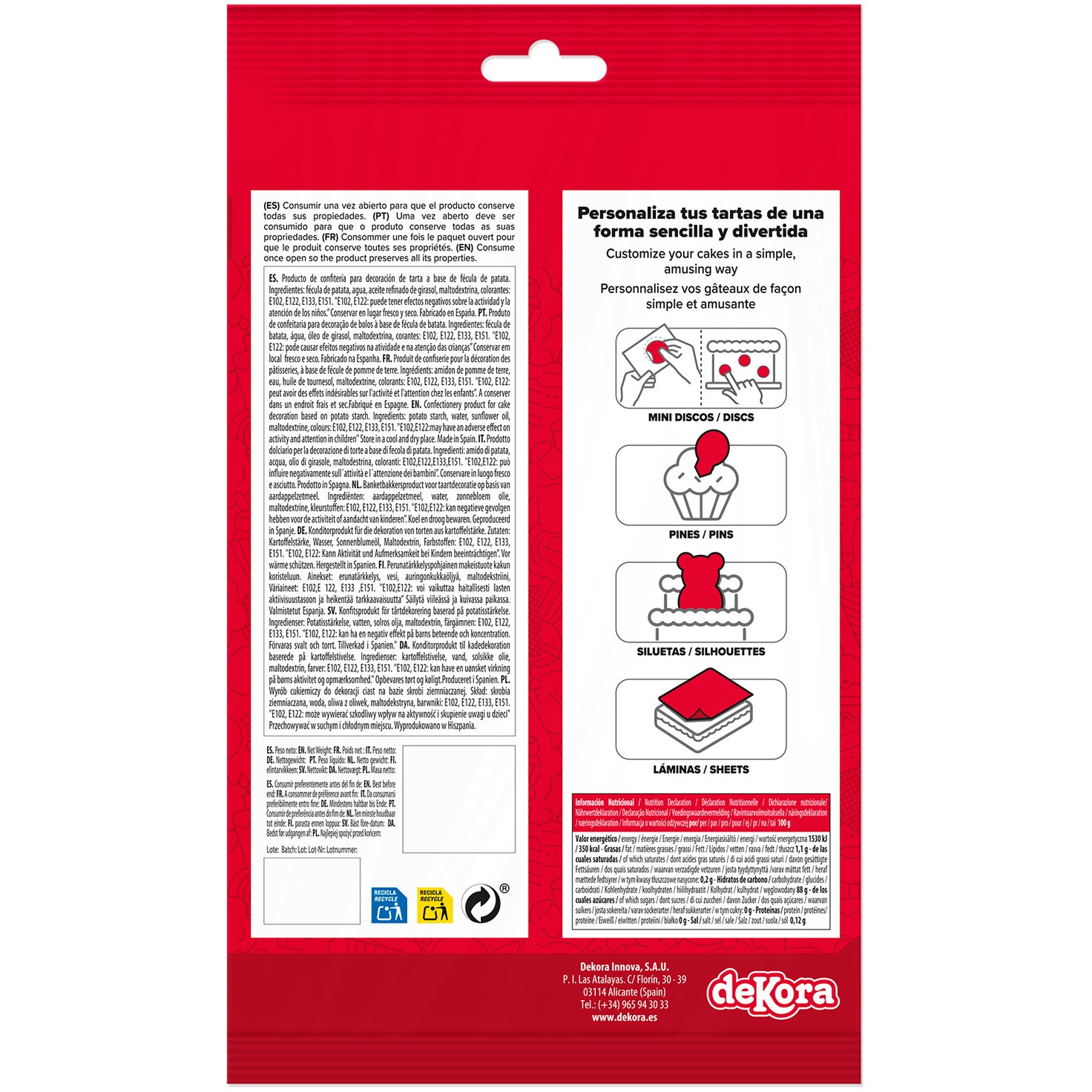 Ingredientes: Óleo de girassol, Fécula de batata, Corantes: E102, E122, E133, E151, Espessante: Maltodextrina, Emulsionantes: Lecitina de girassol.