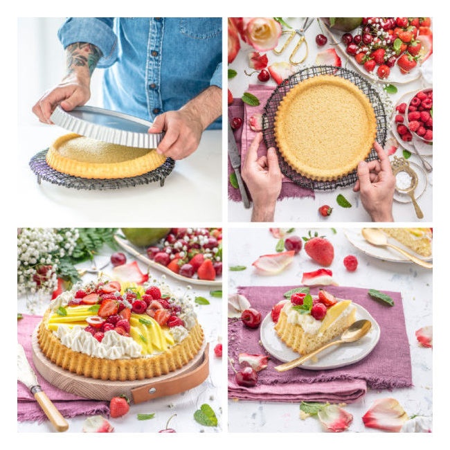 Com esta forma pode criar belas tartes de fruta. Trata-se de um tipo particular de forma com uma ranhura na base que permite, uma vez desenformada a sobremesa, obter uma ranhura para completar com o recheio da sua escolha.