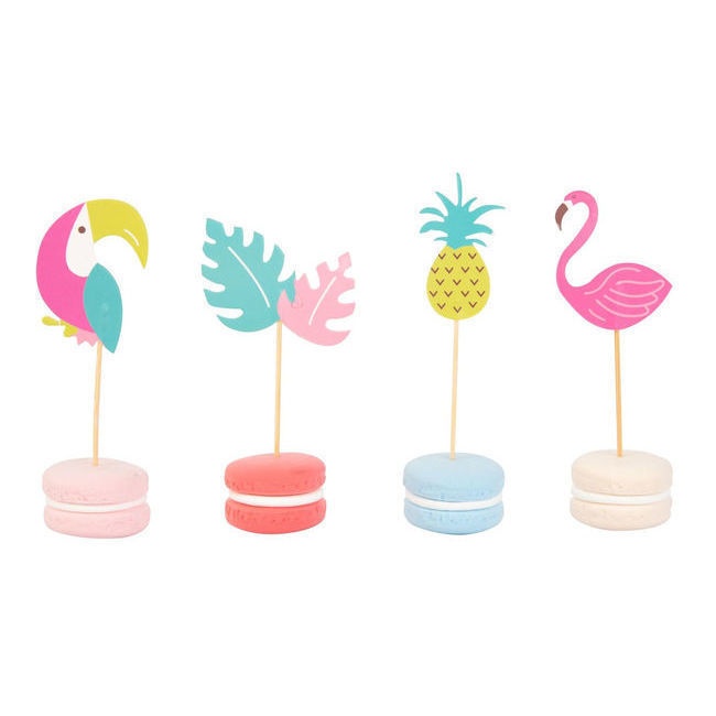 Bonita embalagem de cápsulas e palitos para cupcakes com motivos tropicais, ideais para cozer e decorar as suas deliciosas sobremesas, dando cor e diversão à sua mesa de doces.