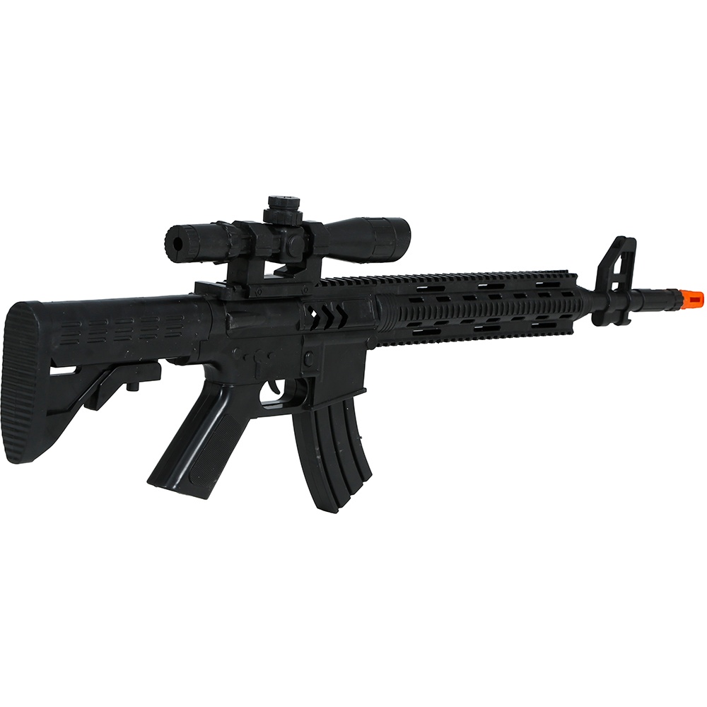 Fuzil de assalto realista concebido como acessório para fantasias de polícia, militar ou forças especiais. O seu desenho detalhado proporciona um visual autêntico em carnavais, eventos de cosplay e sessões fotográficas temáticas. Fabricado em PVC leve, com ponta laranja de segurança, para um uso visualmente realista e responsável. Acessório ideal para completar a caracterização do(a) senhor(a) sem acrescentar peso excessivo.