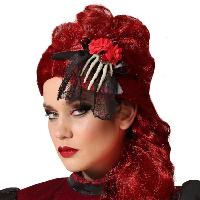 Gancho de cabelo com um enfeite de mão de esqueleto, com renda preta e cor-de-rosa e jóias. Um acessório elegante para o seu look de Halloween.