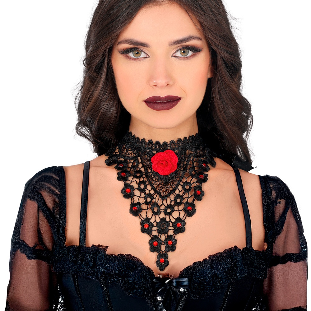 Gargantilha bordada com rosa vermelha