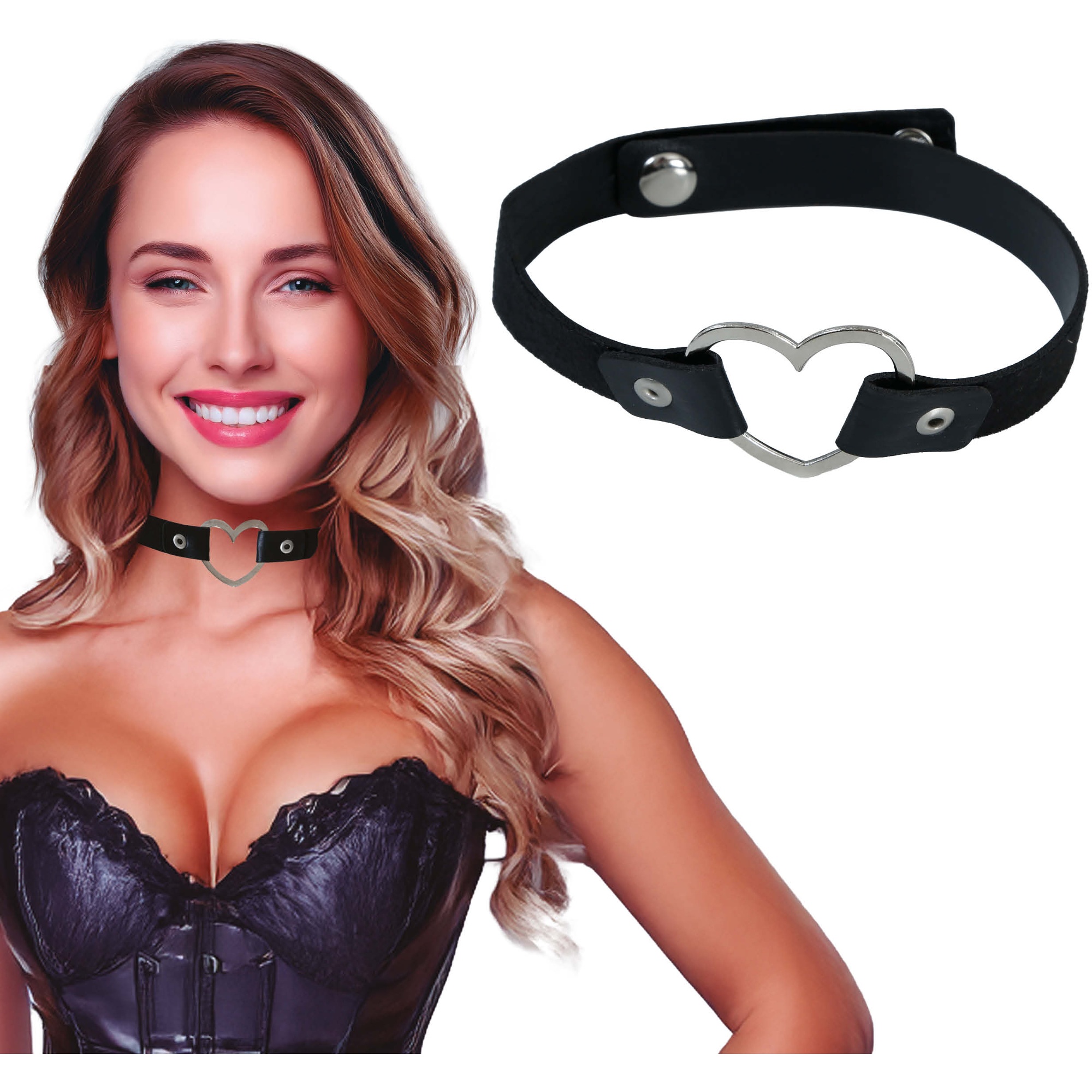Gargantilha sado concebida para despedidas e noites especiais. Apresenta uma peça central em forma de coração metálico que confere um toque atrevido e elegante. A tira é ajustável por botões de pressão para um ajuste confortável e seguro. Trata-se de um acessório sensual que valoriza a lingerie e os looks íntimos.