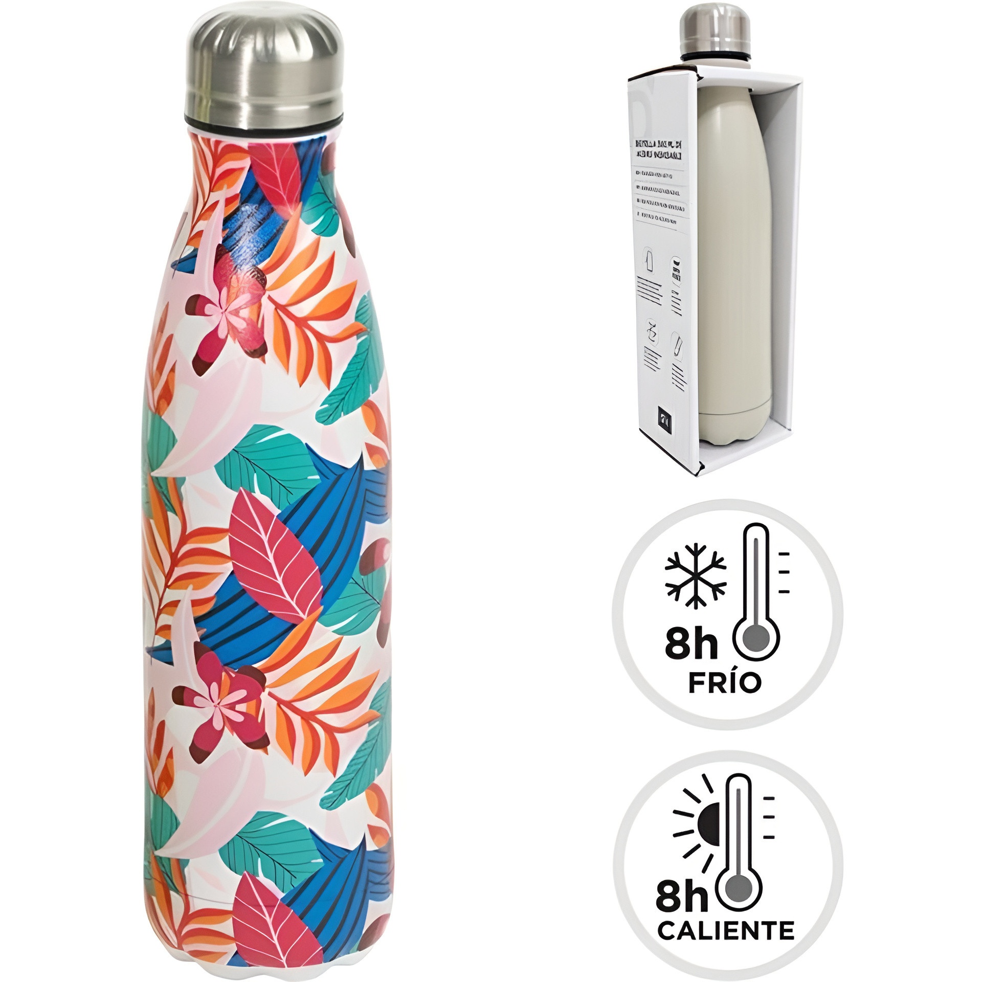 Garrafa térmica com uma estampa tropical alegre que acrescenta estilo às suas bebidas. Mantém o frio e o calor por 8 horas para que desfrute das suas bebidas na temperatura ideal. O seu formato compacto e decorativo torna-a uma opção prática para o dia a dia e para atividades de lazer.