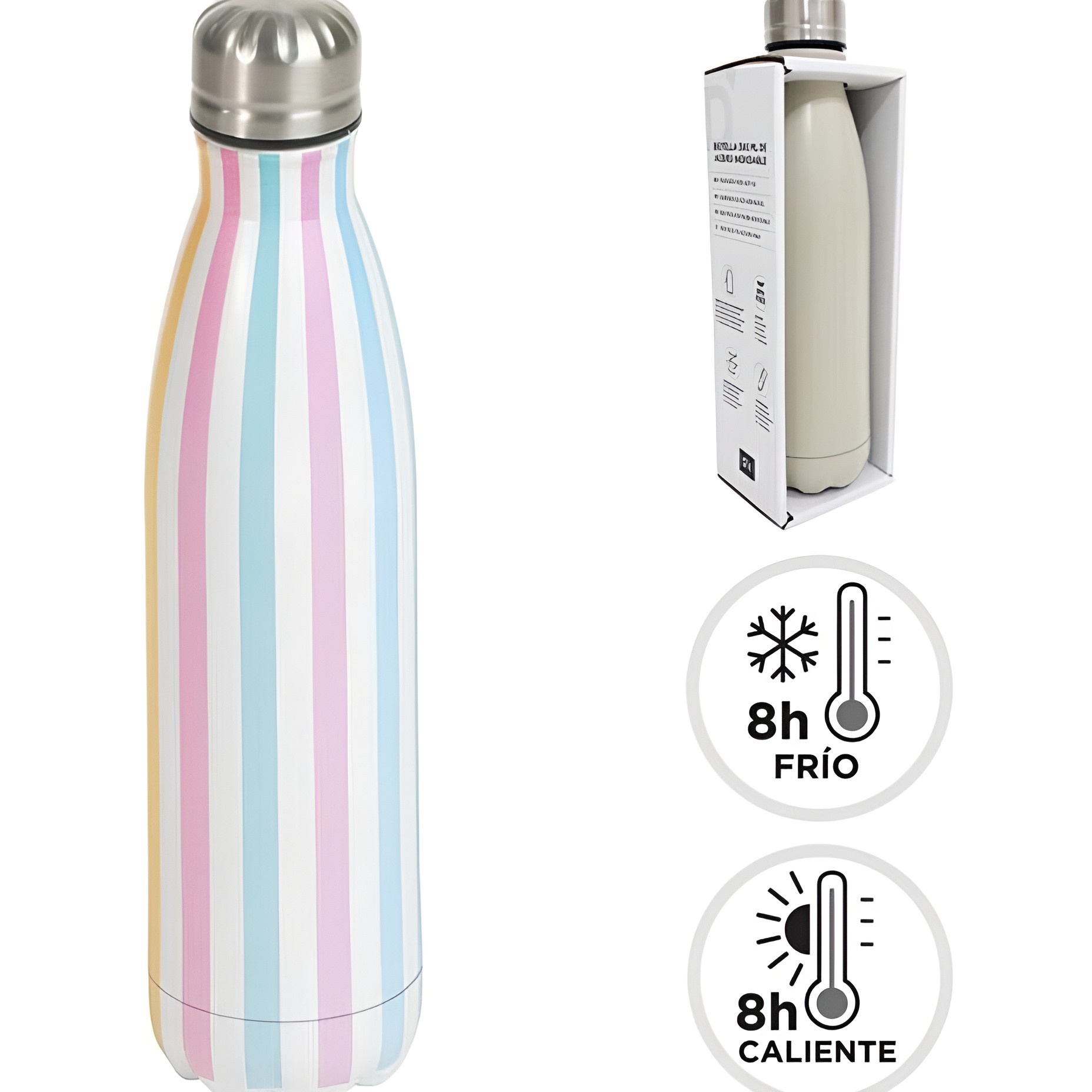 Garrafa térmica com um alegre design de listras em tons pastel que dá cor e estilo ao dia a dia do(a) senhor(a).