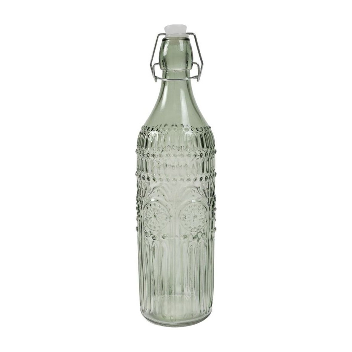 Garrafa elegante reutilizável com um delicado padrão gravado em tom verde-água que confere um toque vintage a qualquer mesa. O fecho hermético assegura um transporte seguro e evita derrames. Versátil para servir água, sumos e outras bebidas frias, funciona como peça funcional e decorativa. Uma opção prática e com estilo para reduzir o uso de embalagens descartáveis.