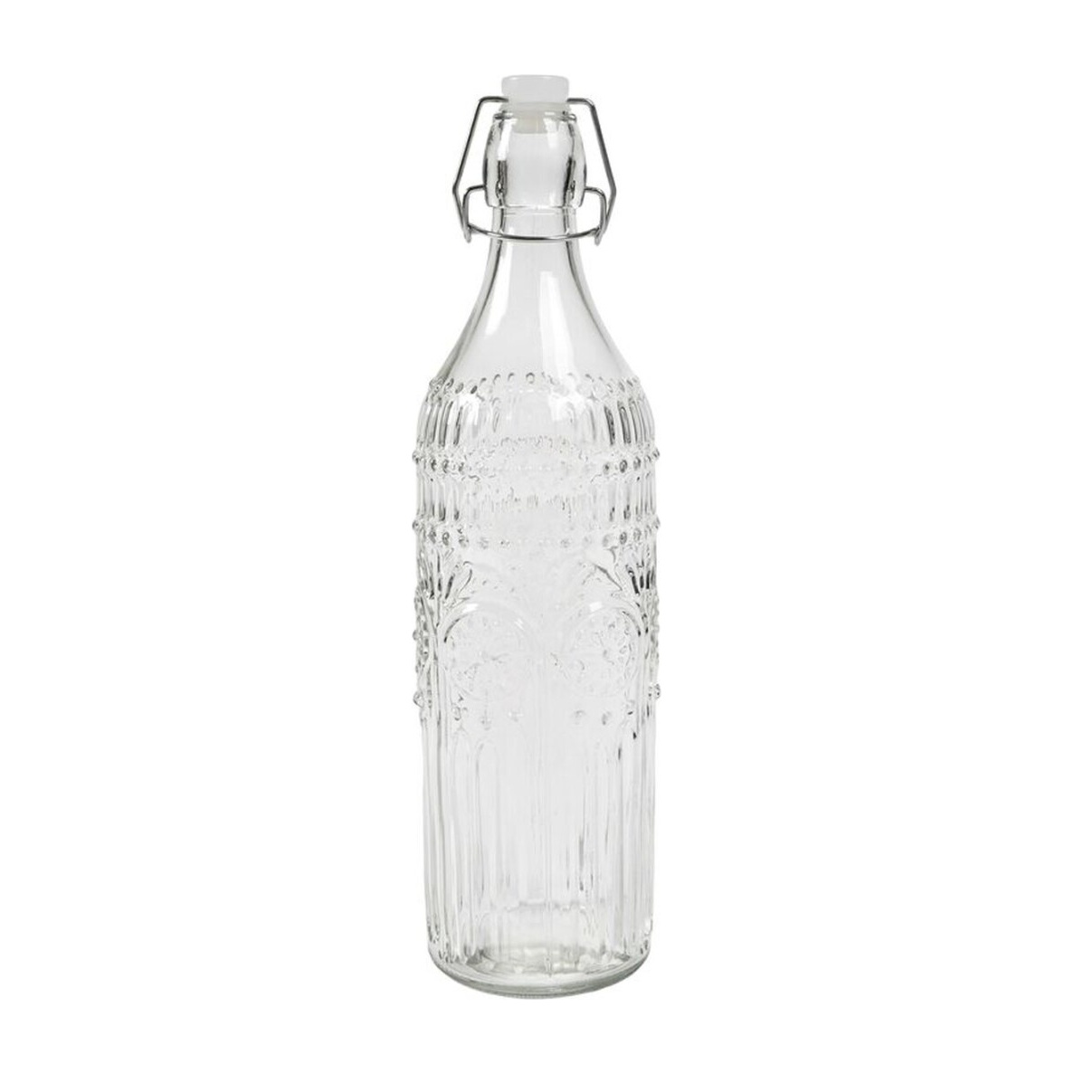 Elegante garrafa de estilo vintage com relevo gravado que acrescenta carácter e estilo a qualquer mesa ou canto da casa. Possui fecho hermético tipo clip que garante vedação segura e evita derrames. Com capacidade aproximada de 1 L, é prática e decorativa ao mesmo tempo, perfeita para que o senhor/a senhora armazene bebidas, óleos ou vinagres e para apresentar em eventos e celebrações.
