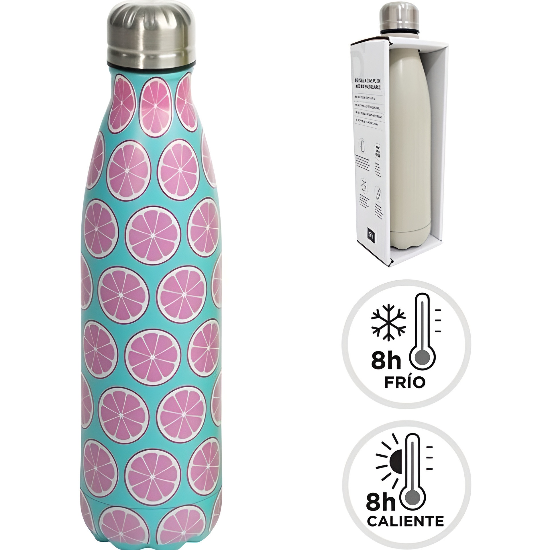 Garrafa isotérmica com uma alegre estampa de frutas, perfeita para levar as suas bebidas favoritas com estilo. Design moderno e colorido que acrescenta um toque divertido ao seu dia a dia. Leve e fácil de transportar, ideal para o escritório, a academia ou para atividades ao ar livre.