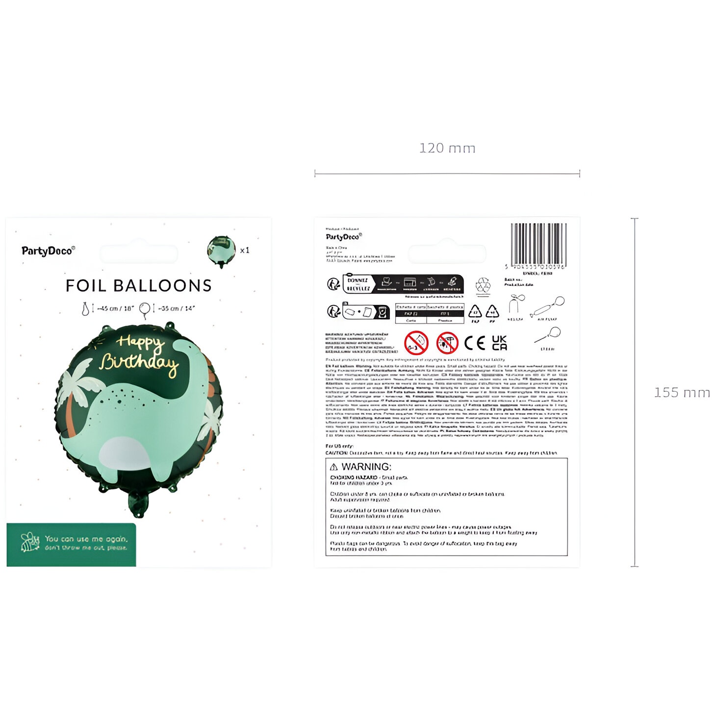 Globo foil com design de brontossauro e a inscrição "Happy Birthday", pensado para ambientar aniversários infantis. Cores mistas e acabamento brilhante que proporcionam um toque alegre e divertido à decoração. Dimensões antes de inflar aprox. 45 x 45 cm e após inflado aprox. 35 x 35 cm. Pode ser inflado com ar ou hélio e utilizado como centro de mesa ou pendurado em guirlandas.