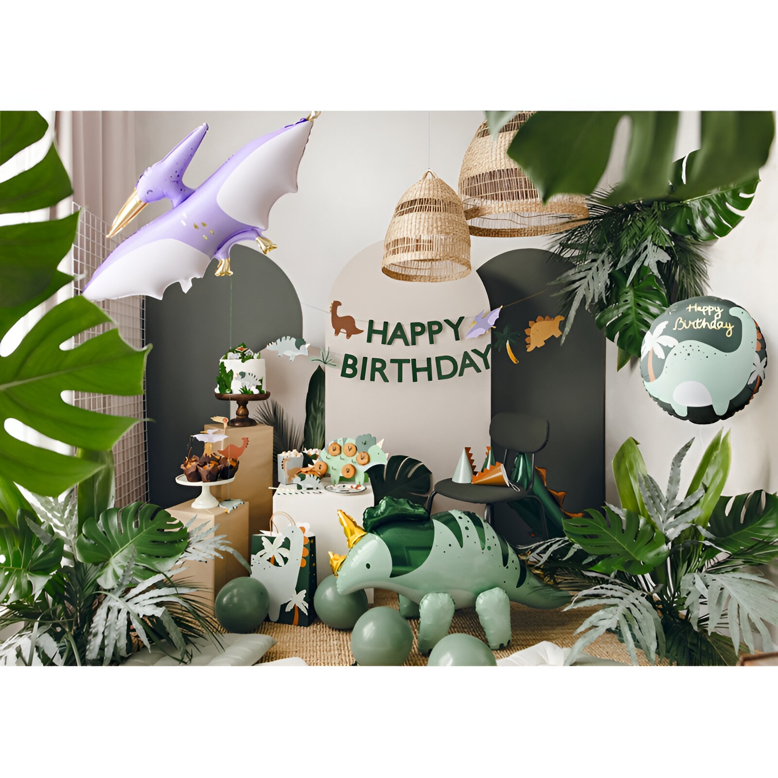 - Decoração temática: design de brontossauro com a frase "Happy Birthday", ideal para festas infantis.